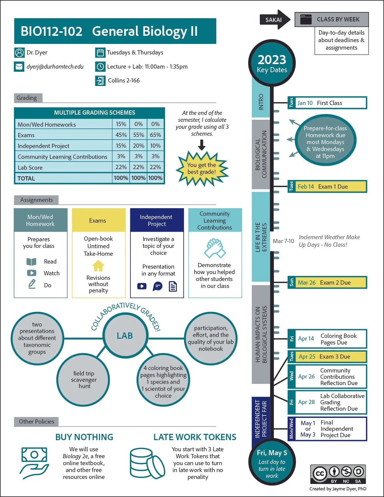 I give students a 1-page graphical syllabus to accompany the full written syllabus for my courses. The file format is for Adobe Illustrator (.ai). I’ve shared these templates under the Creative Commons “non-commercial, share-alike” license, which means you can use and adapt my templates, but you cannot sell the files or derivatives, and you must share them under the same license.